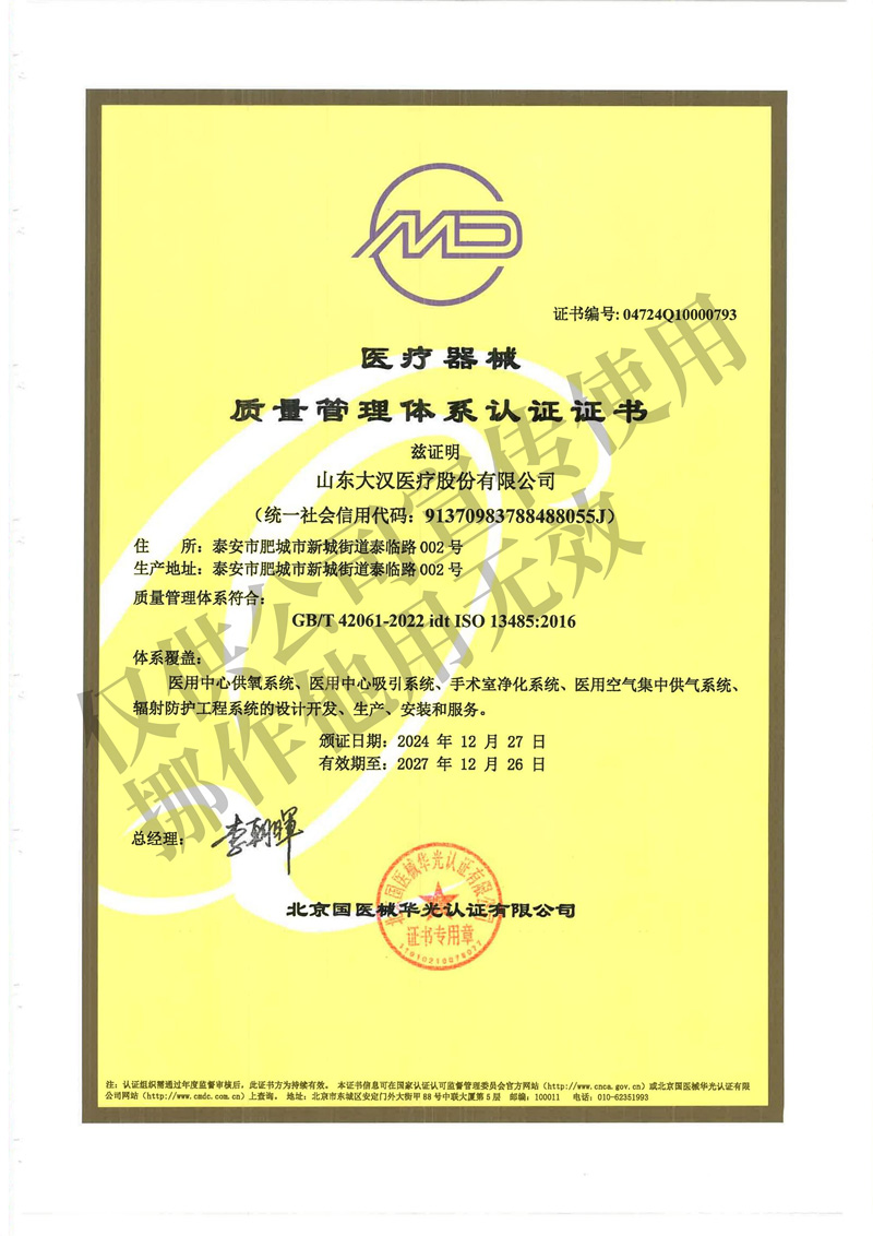 山东大汉医疗股份有限公司,是一家致力于建设高标准医疗综合体的专家级设计、采购、施工,提供交钥匙工程的综合性集团公司,集医用洁净工程系统、医用中心供气系统、医用射线防护、屏蔽工程于一体的国家级高新技术企业。