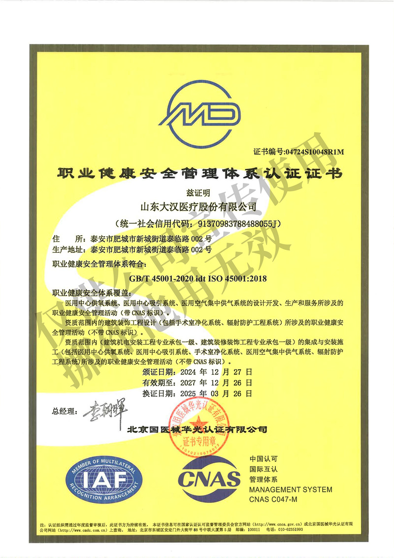 山东大汉医疗股份有限公司,是一家致力于建设高标准医疗综合体的专家级设计、采购、施工,提供交钥匙工程的综合性集团公司,集医用洁净工程系统、医用中心供气系统、医用射线防护、屏蔽工程于一体的国家级高新技术企业。