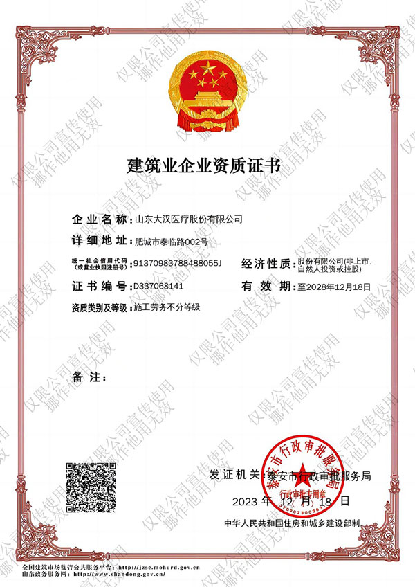 山东大汉医疗股份有限公司,是一家致力于建设高标准医疗综合体的专家级设计、采购、施工,提供交钥匙工程的综合性集团公司,集医用洁净工程系统、医用中心供气系统、医用射线防护、屏蔽工程于一体的国家级高新技术企业。